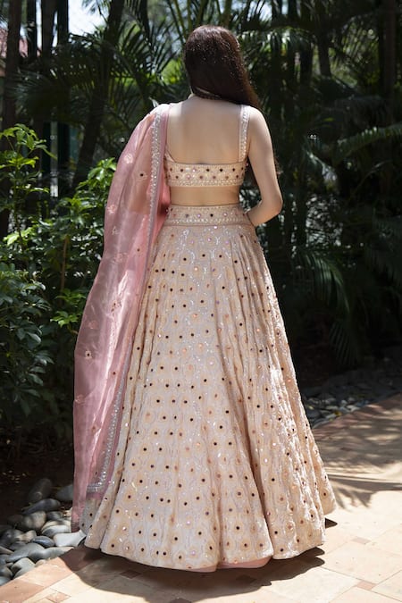 Champagne lehenga with floral embroidery & patchwork detailing. Paired with sleeveless embroidered blouse, layered dupatta & cancan under skirt.