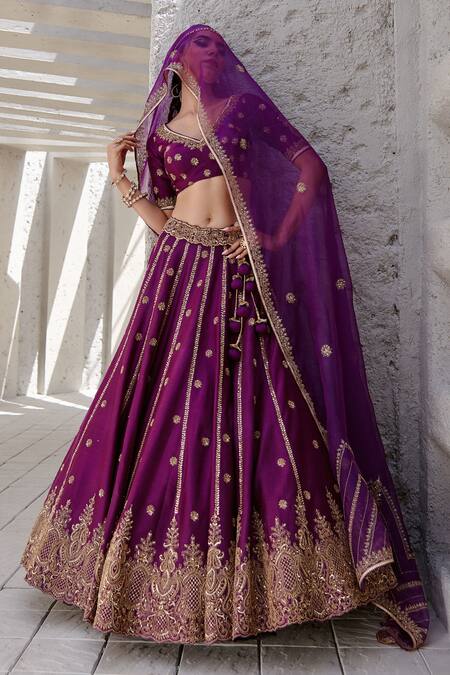 Midnight purple lehenga with gold dori & aari embroidered floral motifs. Paired with blouse & dupatta.