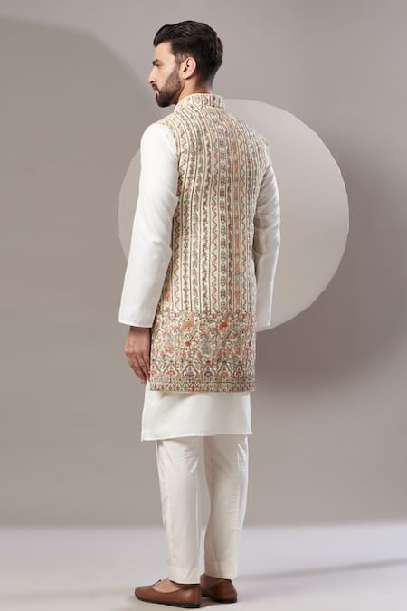 Beige Nehru jacket featuring intricate geometric and floral thread embroidery