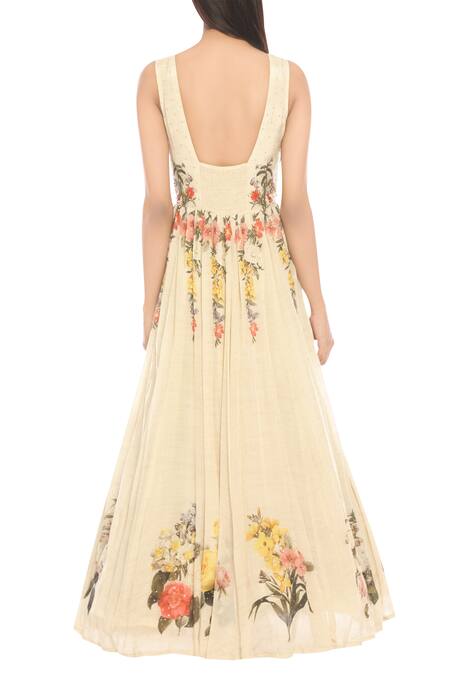 Buy_RI.Ritu Kumar_Off White Rayon Crepe Printed Floral Round Embroidered Maxi Dress With Stole_Online_at_Aza_Fashions