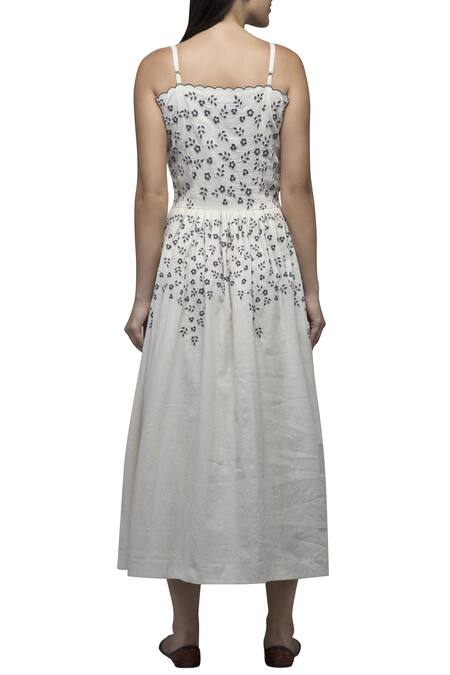 Off White Dobby Cotton V Neck Embroidered Midi Dress