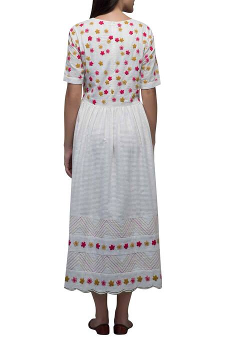 White Dobby Cotton V Neck Embroidered Midi Dress
