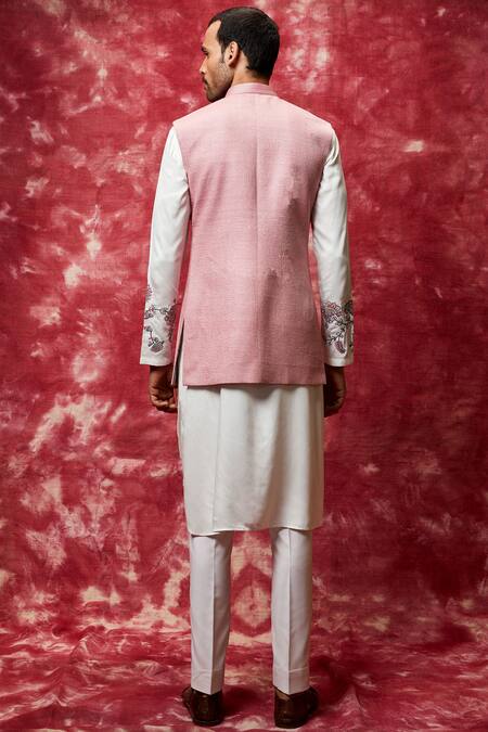 Pink Nehru jacket with all over stitch line work. Comes with white floral embroidered kurta & pants.
