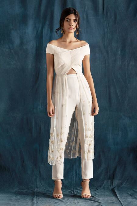 Ivory off shoulder overlap kurta with pleated bodice, floral embroidered motifs & side gathers. Paired with cigarette-fit pant & dupatta.