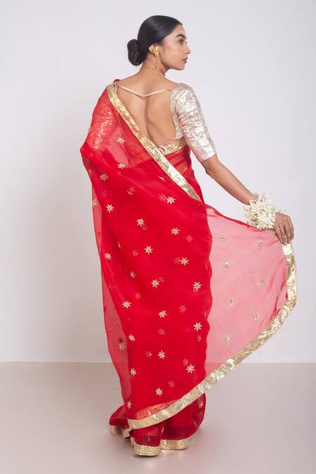 Bright red embroidered organza saree with gota patti & hand crafted buti work.