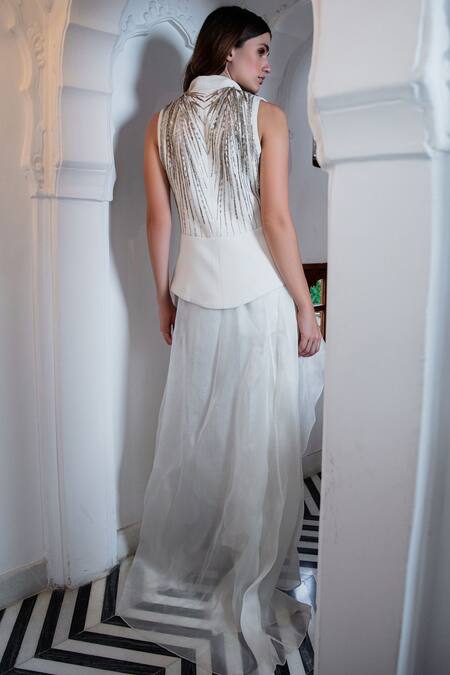 Ivory blazer with placement bead work & button front detail. Comes with plain pants & asymmetric cape.