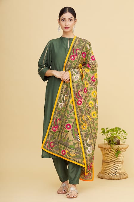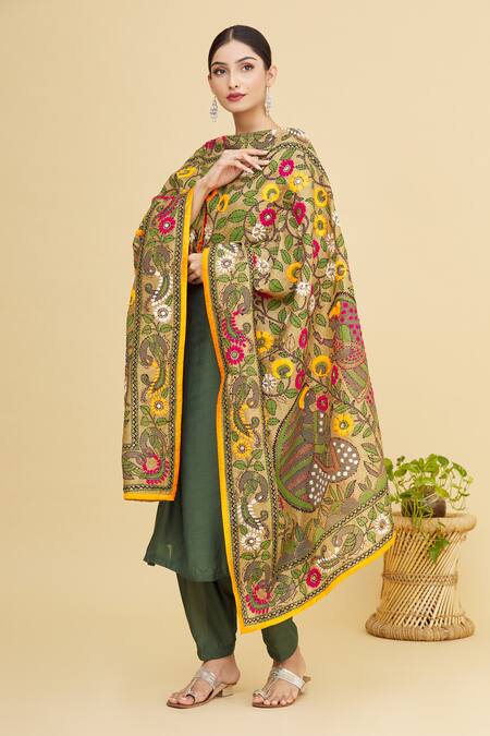Beige phulkari dupatta with embroidered leaf and human motifs with sequin detail and yellow hem.