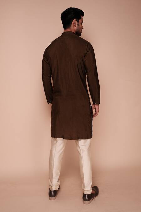 Olive green silk kurta featuring a mandarin collar and embroidered placket with resham thread and sequin work. Paired with fitted cotton blend silk pants.