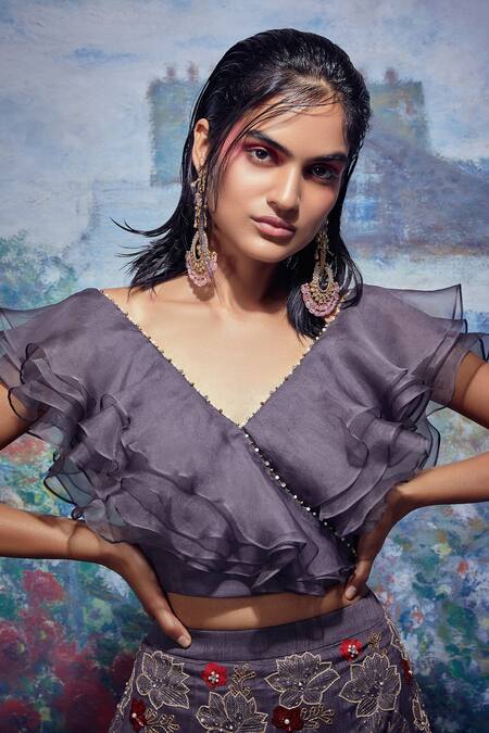 Grey high waist lehenga with zardozi embroidered floral motifs. Comes with crop top.