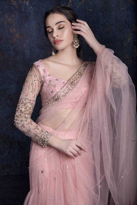 Flamingo pink saree with ruffles. Comes with embroidered blouse & skirt.