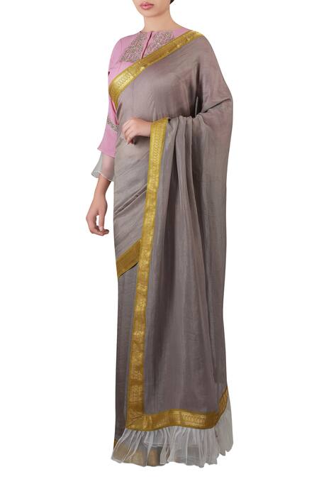 Grey Crepe, Georgette Round Embroidered Saree With Bell Sleeves Blouse