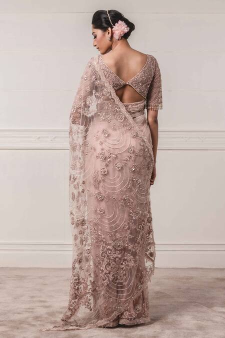 Purple Tulle Leaf Neck Embroidered Saree With Blouse