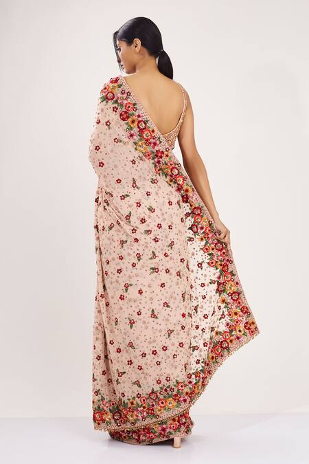 Blush pink saree with all-over multi-color floral motif thread work. Comes with blouse.