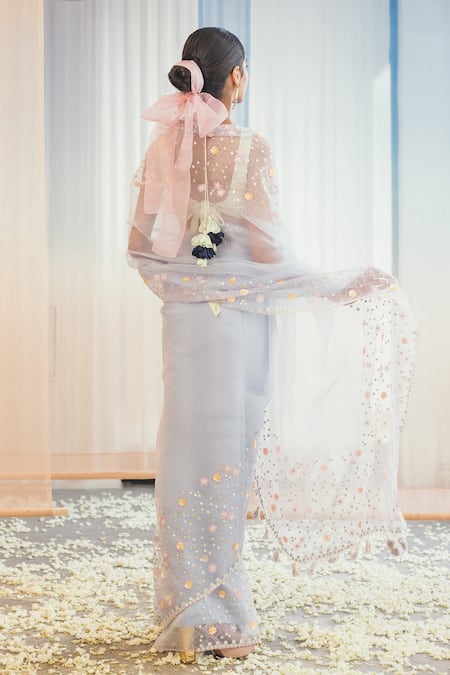 Skyway blue sheer saree with floral embroidery and sequin embellishment. Comes with blouse.