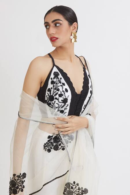Ivory saree in silk organza base fabric, featuring hand embroidered motifs using threads, sequins & bead work. Paired with a contrast black blouse with scallop neckline and embroidery.