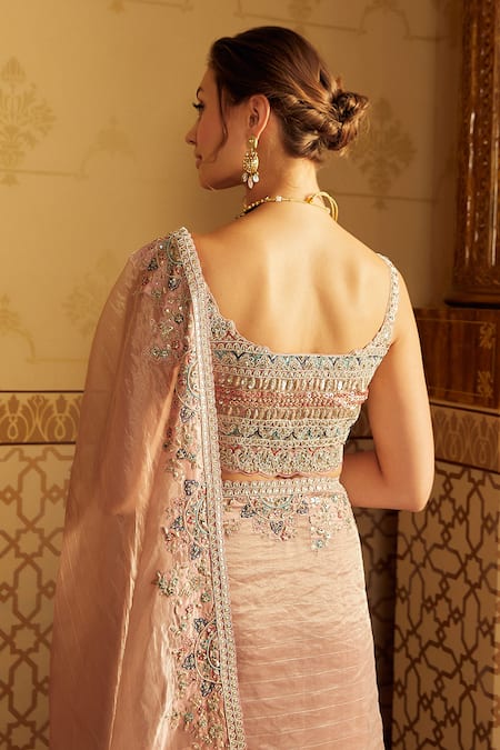 Pink Tissue Organza Floral Sweetheart Neck Embroidered Saree With Blouse
