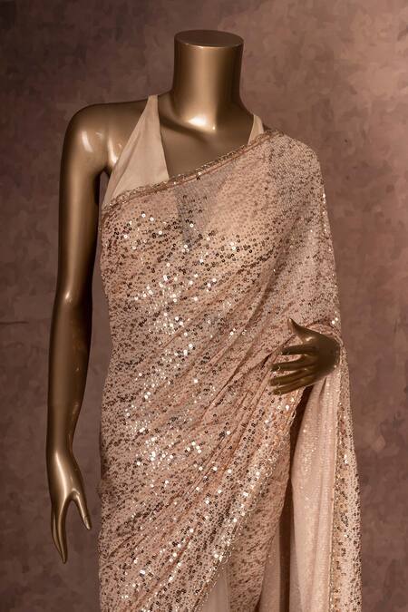 Beige sheer saree with all-over sequin work & bead scallop border. Comes with silk halter blouse.