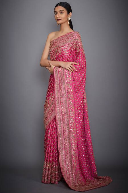 Fuchsia Pink hued satin saree with paisley gold embroidery artwork. Comes with an unstitched blouse.