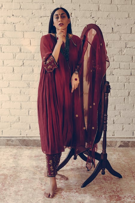 Maroon organza dupatta featuring sequin and bead embroidered scattered buttis