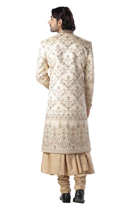 Beige sherwani highlighted with intricate Mughal thread-jaal embroidery, band collar and full sleeves. Comes with gold kurta and churidar.