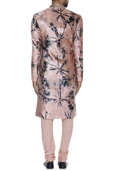 An ethnic ensemble that will help you stay en vogue. This tie-dye sherwani accentuated with zardozi embroidery, and teamed with a solid kurta and churidaar is sure to make heads turn at any occasion.