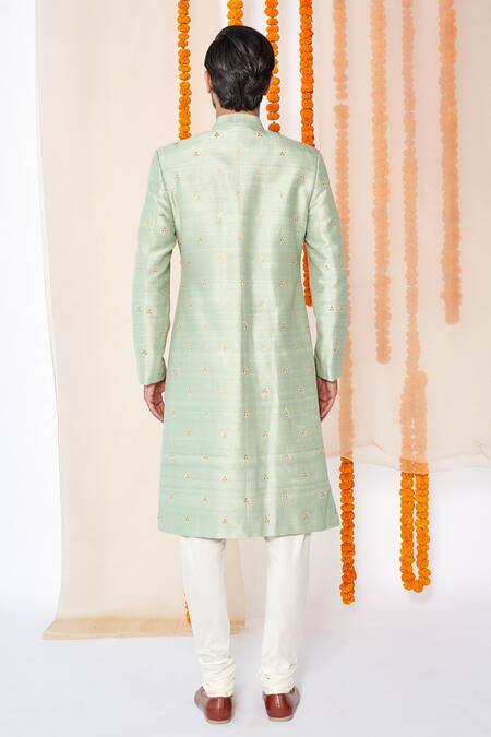 Sage green sherwani with leaf embroidered motifs, patch pocket & sequin work. Paired with churidar.