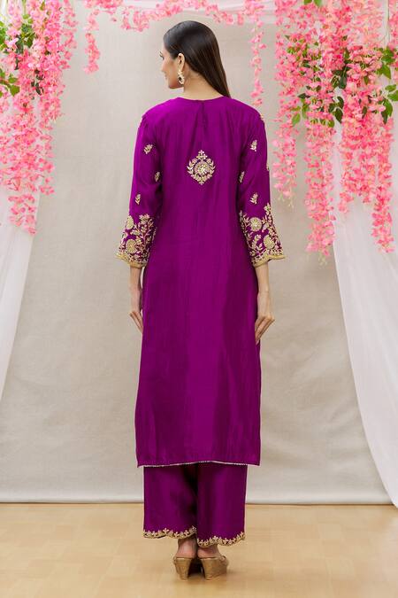 Purple Organza, Spun Silk Floral Motifs Embroidered Straight Kurta Set