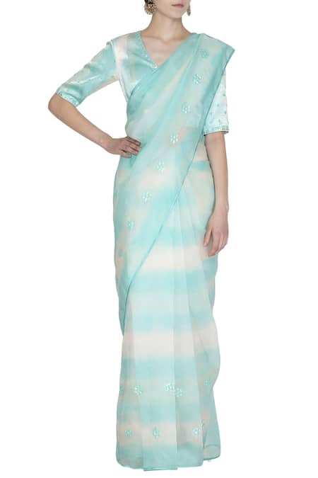 Sky blue tie & dye saree with all over gota patti & sequin work floral motifs. Comes with matching blouse.