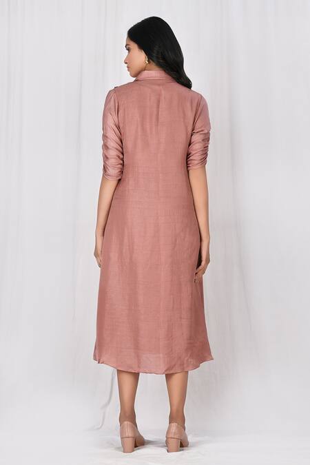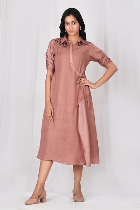 Rose gold wrap dress with hand embroidered yoke in cutdana beads, bow tie-up detailing & ruched sleeves. Comes with an inner.