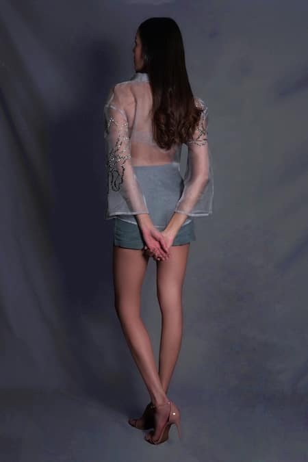 Grey Silk Organza Embroidery Collared Tie-up Jacket