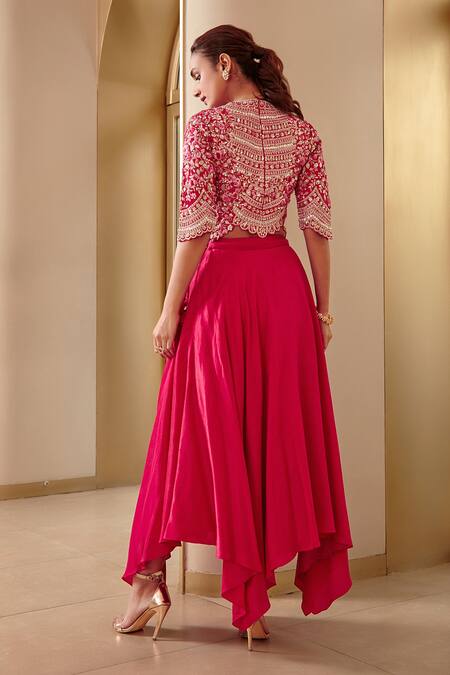 Cherry red mulberry silk top with closed neck, all over hand embroidery in thread, beads & sequin work. Paired with handkerchief asymmetric lehenga with side tasselled tie-up.