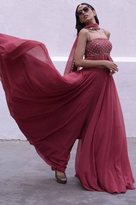 Rust red gharara pants paired with cropped peplum-blouse enhanced with floral motif work. This set comes with scallop border dupatta.