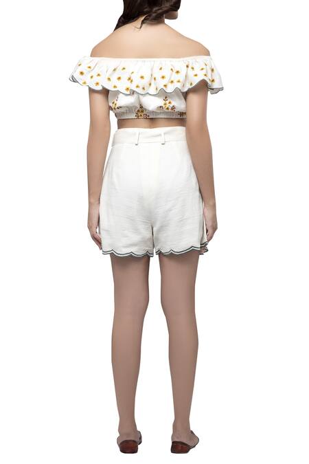 Off white bardot crop top with placement floral motif work. Comes with short pants.