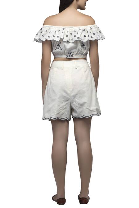 Off white bardot crop top with placement floral motif work. Comes with short pants.