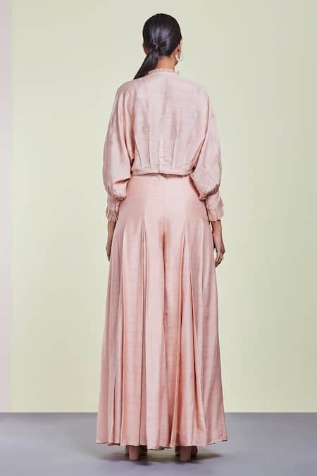Pink flared pant with inverted pleats detail. Comes with top.