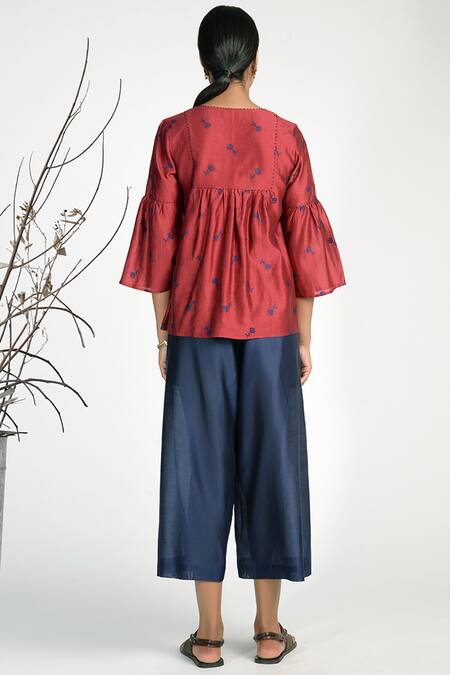 Wine blouse with all-over floral motif work & tie-up neckline.