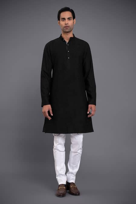Black long waistcoat with tonal thread, paisley embroidery. Paired with kurta & jodhpuri breeches.