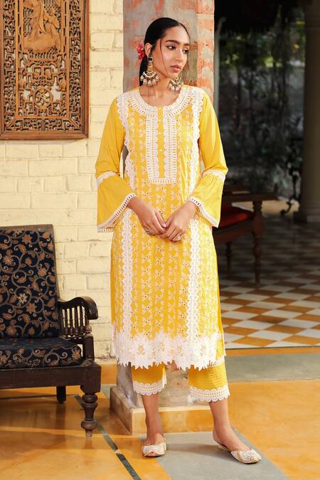 Butter yellow layered bell sleeves kurta embroidered with cotton thread work & scalloped lacework. Paired with cigarette fit pant & chiffon dupatta.