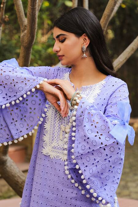 Lilac embroidered cotton kurta with layered bell sleeves, pom pom border & front tie up.