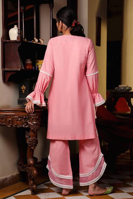 Cotton candy lace work kurta with sheer panel detail. Paired with embroidered pant.