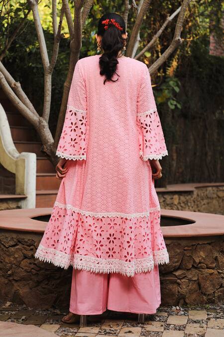 Cotton candy embroidered kurta in cutwork and lace detail. Paired with a solid sharara.
