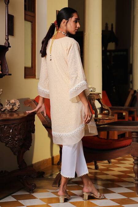 Beige cotton embroidered kurta with scalloped lacework & layered bell sleeves