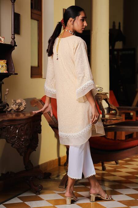 Beige embroidered flared sleeve kurta in cutwork and lace detail. Paired with tulip pant.