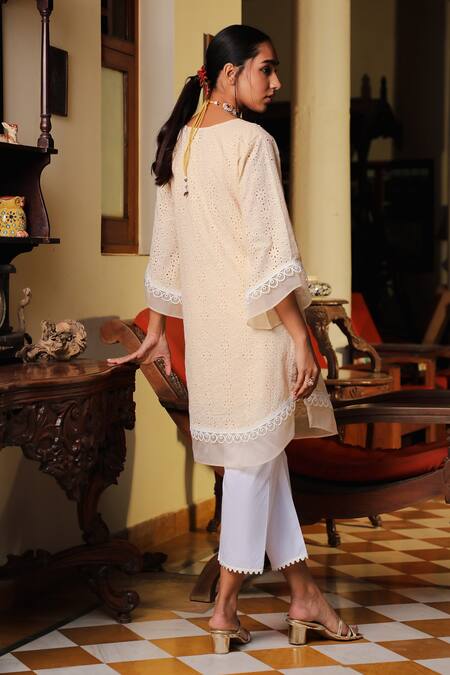 Beige layered bell sleeves short kurta embroidered with cotton thread work & scalloped laces. Paired with tulip pant & mesh dupatta.
