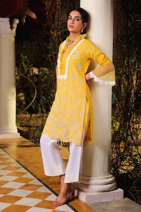 Butter yellow mesh bell sleeves kurta, embroidered with cotton thread work & scalloped laces. Paired with straight pant & mesh dupatta.