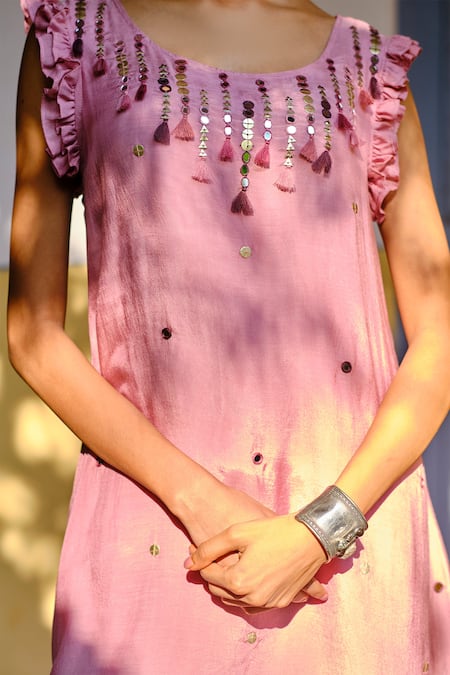 Lavender kurta with mirror embellished, tassel detail & asymmetric hem. Paired with tulip pant.