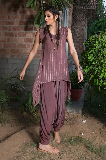Purple Pant Silk Modal Kurta Shimmer Georgette Round Embellished Dhoti Set
