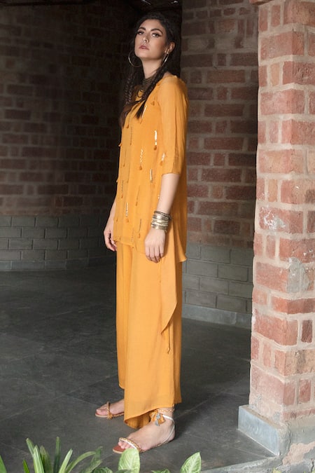 Mustard yellow short kurta with metallic embellished motifs and asymmetric hem. Comes with flared pant.