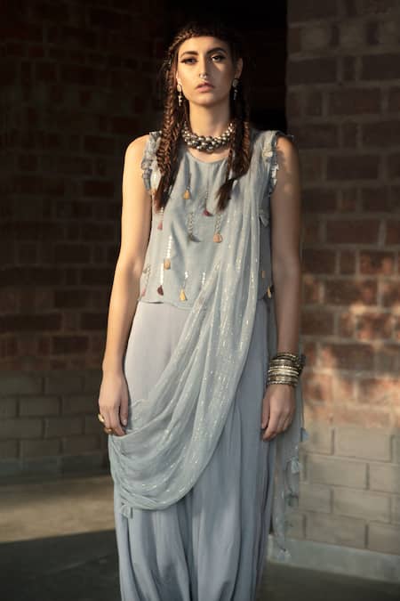 Powder blue cowl pant with attached embellished drape. Comes with top.