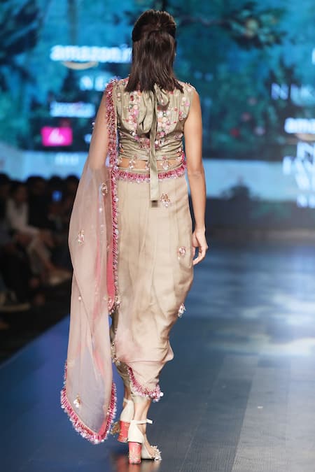 Buy_Nikasha_Grey Organza, Crepe Floral Motifs Round Enmbroidered Dhoti Saree With Blouse _at_Aza_Fashions